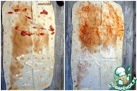 Поставить духовку разогреваться до 200 градусов. Одну половину лаваша смазать кетчупом, другую майонезом.