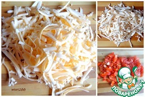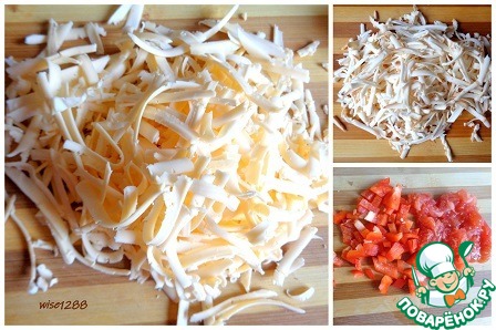 Два вида сыра нашинковать. Помидоры и сладкий перец нарезать мелко.