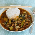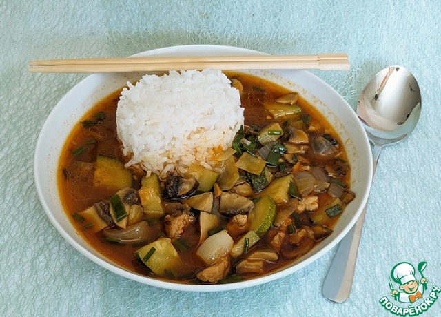 К нему подают рис, но мы например, любим с рисовой лапшой, поэтому дело вкуса.