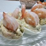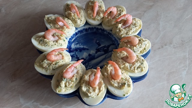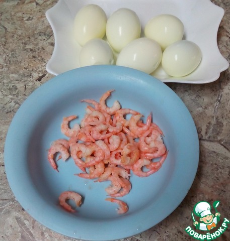 Креветки отварите в кипящей подсоленной воде в течение 2-3 минут, затем сразу же переложите в ёмкость с холодной водой либо промойте под струёй холодной воды. Очистите. Несколько креветок отложите для украшения (штук 12, по количеству яичных половинок). Яйца разрежьте пополам, желтки извлеките и переложите в чашу блендера.