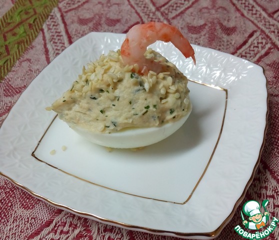 Половинки из яичных белков заполните получившимся креветочным паштетом, украсьте ранее отваренными и очищенными креветками (оформив шеи и головы нашим "лебёдушкам"), присыпьте кунжутом (оформив "пёрышки"). Переложите на блюдо для подачи закуски.