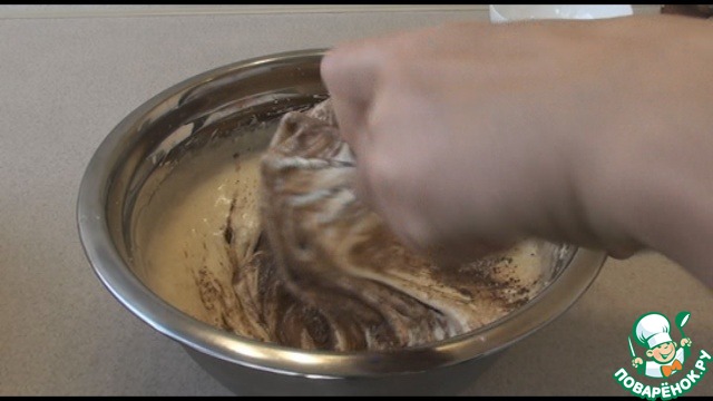 Вместе с мукой просеем разрыхлитель и какао и вмешаем в тесто.