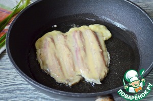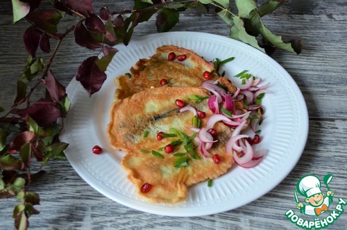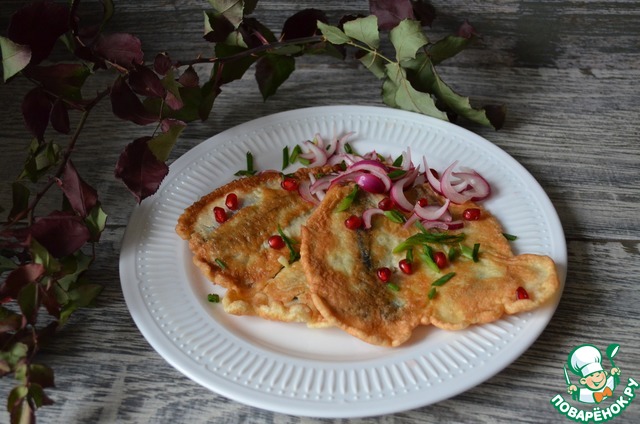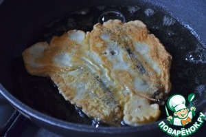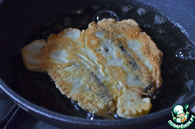 Окунуть в кляр тушку салаки, перенести в сковороду с разогретым растительным маслом.