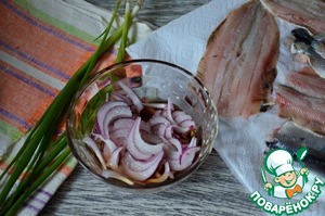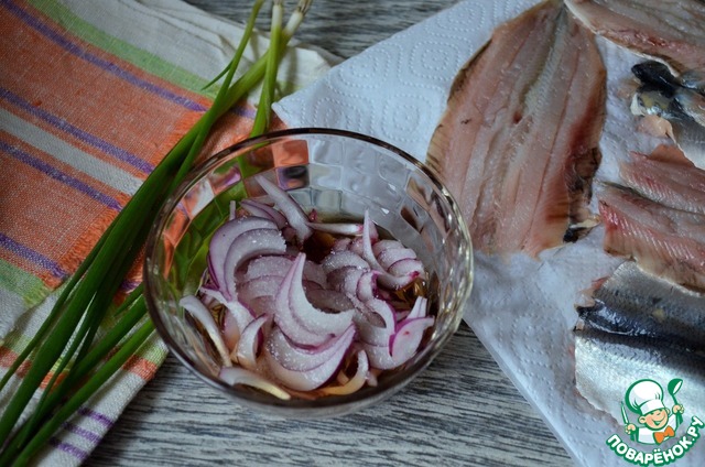 Красный лук нарезать, залить уксусом + 1ст. л. холодной воды, отставить.