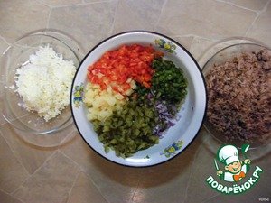 Нарезать как можно мельче репчатый лук, болгарский перец, соленые огурцы, вареные яйца и вареный картофель.