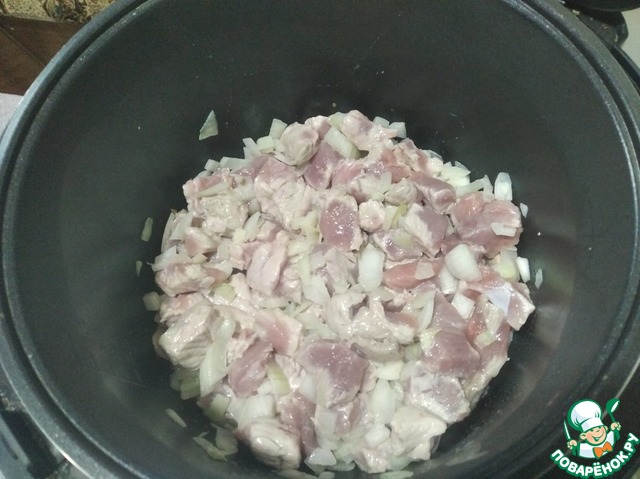 Отправляем в чашу растительное масло, лук и свинину - Режим "Жарка" 15 минут. (Желательно каждые 2-4 минуты перемешивать)