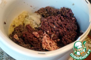 Пропустить мясо и сало через мясорубку, добавить чеснок и хлеб.