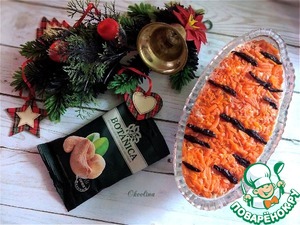 Самый верхний седьмой слой - слой моркови. Аккуратно, используя силиконовую лопаточку, наносим слой, утрамбовывая ровно поверхность салата. Раскладываем полоски чернослива, изображая полоски тигра на шкуре. Ставим салат в холодильник до подачи на праздничный стол. Если вы такой салат приготовите на обычный обеденный стол, то его можно есть и сразу, он очень вкусный будет и без настаивания. Его не обязательно будет собирать слоями, а просто заправив по вкусу майонезом, перемешать.