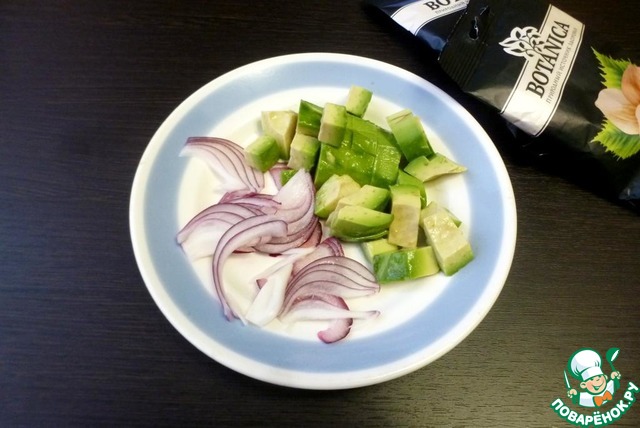 Авокадо почистить и нарезать кубиком. Сбрызнуть соком лимона. Лук нарезать перьями и посыпать щепоткой сахара.