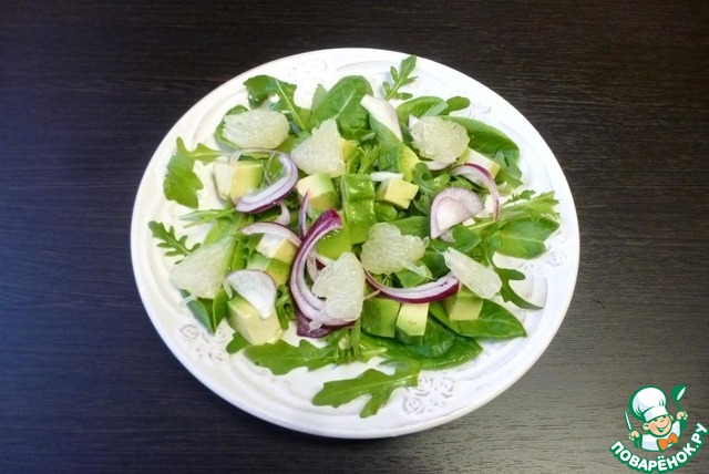 Остаётя собрать салат. На тарелку выложить микс разной салатной зелени. Раскидать по ней кусочки авокадо, помело, лук.