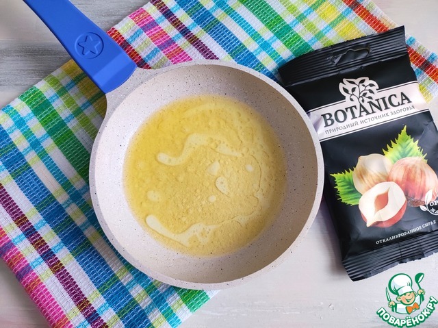 Масло сливочное (20 гр.) растопить. Добавить теплое масло в молочно-яичную смесь, затем добавить 2 капли ванильной эссенции.