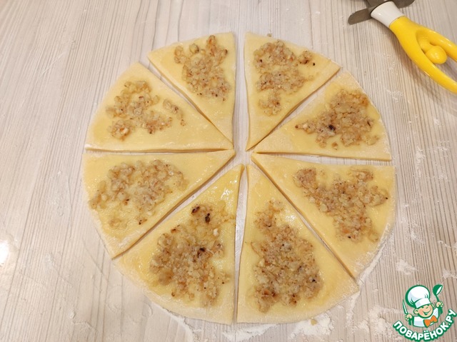 Тесто раскатать в круг, при помощи резца-колесика разрезать круг на сегменты, смазать растопленным сливочным маслом, выловить на каждый сегмент не большое количество ореховой смеси. Сформировать рогалики.