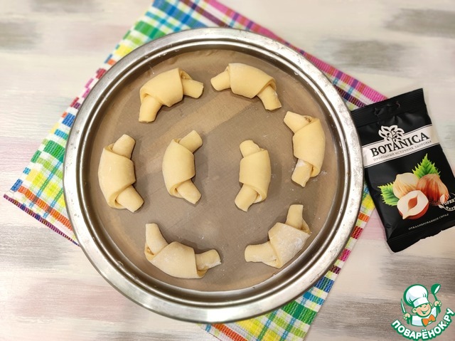 Выложить рогалики в форму для выпекания. Накрыть рогалики салфеткой и дать расстояться в течение 30-40 мин. Далее форму отправить в разогретую до t200С духовку. Выпекать рогалики до красивой румяности.