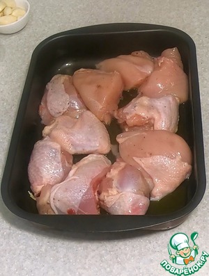 Разделать курицу на порционные кусочки. Хребет вырезать и отложить (в этом блюде он нам не понадобиться, приготовьте из него, например, отличный бульон). Посолить, поперчить.