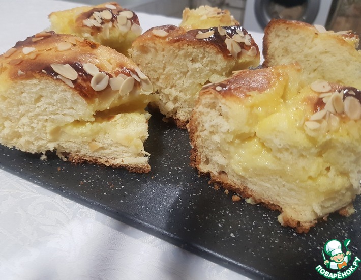4. Пальцами делаю " ровчики" в тесте по кругу, смазываю тесто желтком, кремом заполняю ровчики с помощью кондитерского мешочка или шприца, тесто посыпаю миндальными лепестками и отправляю в духовку разогретую до 180С на 40 минут.