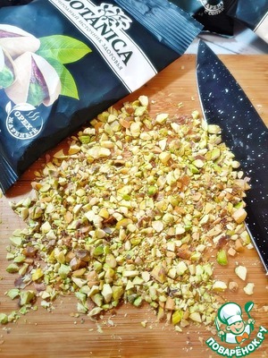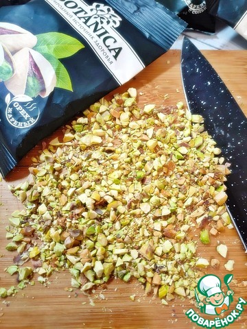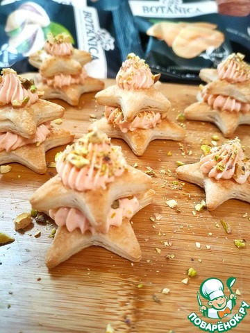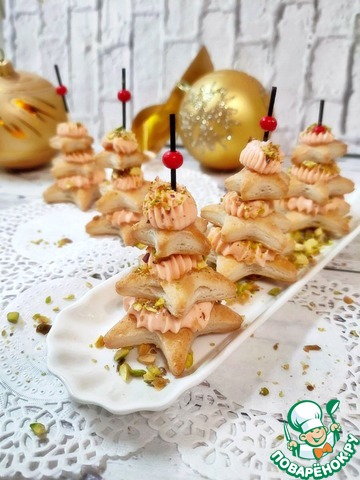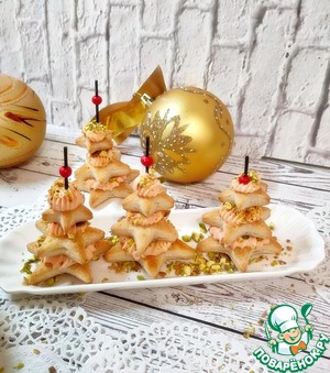 Теперь соберите ёлочку. Крем выкладывайте на заготовки из слоёного теста. Посыпьте рубленными фисташками.