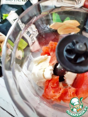 Пока тесто выпекается, приготовьте крем из лосося. В чашу блендера выложите лосось и сливочный сыр. Пробейте до однородности.