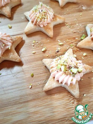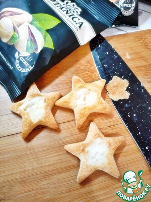 Освободите тесто от упаковки, разложите пласты (я использовала 1 лист) и оставьте размораживаться при комнатной температуре на 15-20 минут, пока не станут мягкими. Затем припылите рабочую поверхность мукой, раскатайте пласт в одном направлении. С помощью фигурных формочек (у меня звездочки, но это могут быть и кружочки, и цветочки...) вырежьте по 3 разных размера. Заготовки выложите на противень и отправьте выпекаться в разогретую духовку (t - 180), до готовности. Когда звёздочки из теста подрумянятся, достаньте их из духовки и полностью остудите.