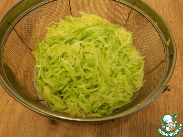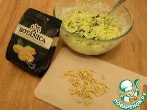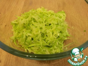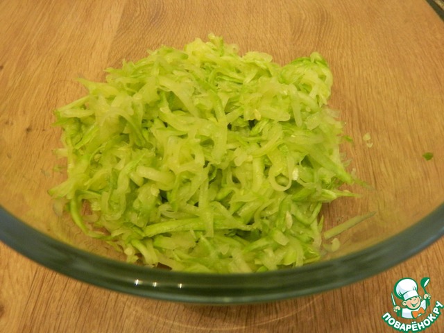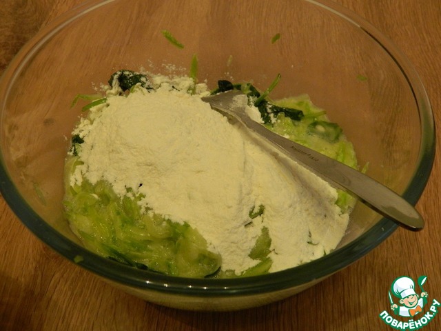 Добавим муку с разрыхлителем, немного присолим, перемешаем. Муки можно положить меньше, у меня тесто получилось достаточно густое. Все будет зависить от веса кабачков и насколько Вы отжали их от жидкости.