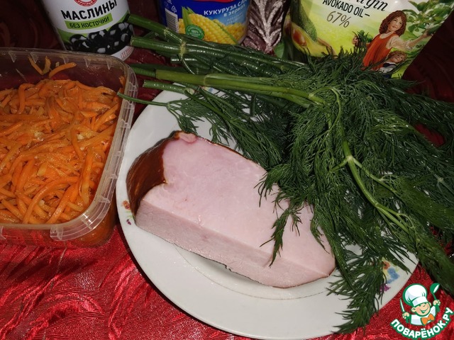 Продукты для салата. Салат слоёный. Я готовила в двух салатницах, вторая пала в неравном бою с котом-фанатом маслин.