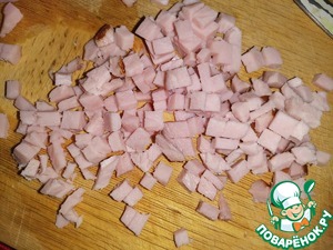 Нарезать карбонад мелкими кубиками. Уложить в салатницу.