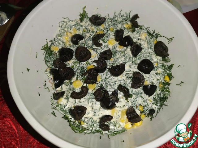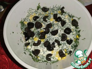 Далее выкладываем маслины в виде кисти винограда и укроп. -