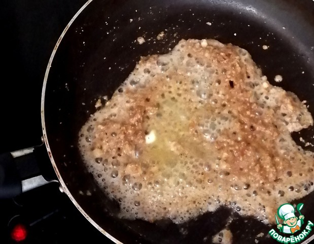 В сковороде или сотейнике прогреть орехи со сливочным маслом, добавить соевый соус. Отдельно развести кунжутную муку водой, чтобы не было комочков, влить к орехами. Довести до кипения, постоянно помешивая.