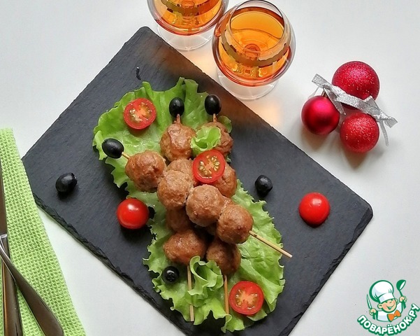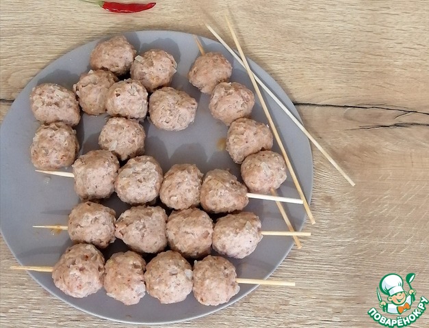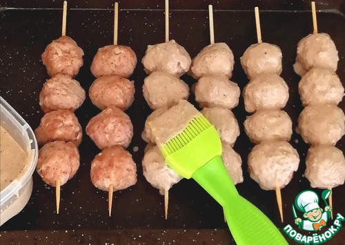 Нанизанные на шпажки фрикадельки, обильно смазать готовым соусом со всех сторон.