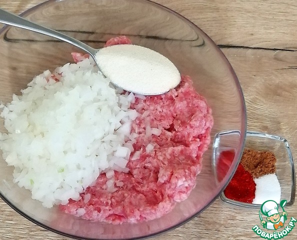 Подготовленный мясной фарш соединить с мелко порубленным репчатым луком, всыпать семолину, соль, мускатный орех молотый и перец.