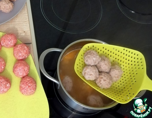 В кастрюлю с кипящей, чуть подсоленной водой, выложить фрикадельки. Делайте такую порцию, чтобы фрикадельки свободно плавали в воде,