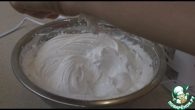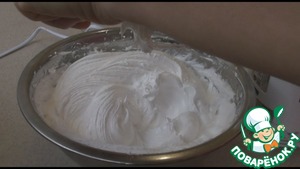 В отдельной посуде хорошо взобьем 2 яичных белка, потом продолжая взбивать постепенно добавляем 140 гр сахара. Безе должно получится плотное, если его перевернуть оно остается на месте. Взбивать нужно 10 минут.
