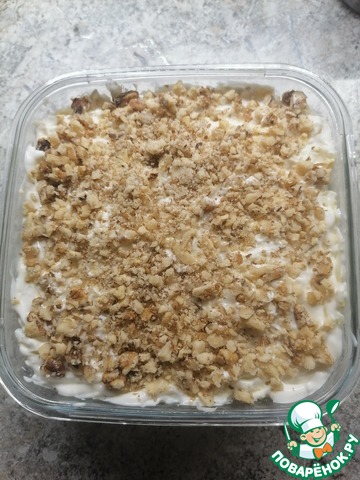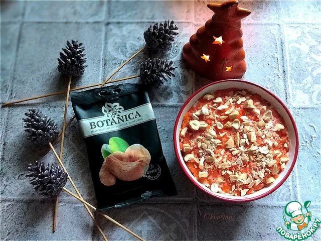 Морковь выкладываем верхним слоем. Её я не буду мазать майонезом. Она сочная и майонеза в салате достаточно. Майонеза кладите на слои по своему вкусу, не забывая о печени. Самый верх салата для праздничного новогоднего стола присыплю обжаренными орешками кешью ТМ BOTANIKA. Немного их ножом измельчу.