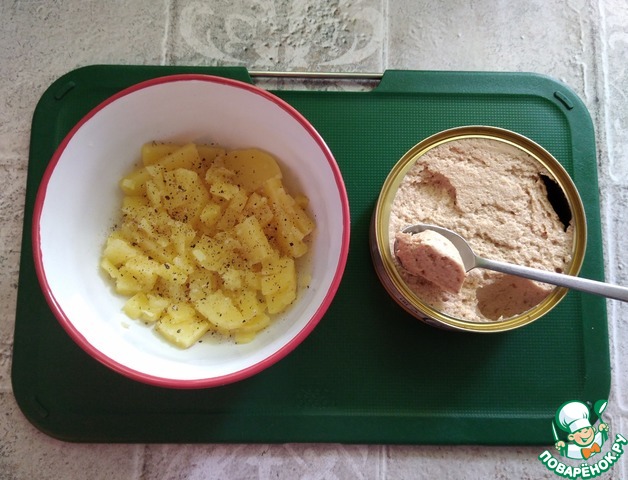Картофель чистим от шкурки и нарезаем мелким кубиком, можно натереть на тёрке крупной. Выкладываем картофель первым слоем в салатник. Немного его присаливаем и перчим свежемолотым чёрным перцем. Открываем баночку печени. Она как паштет и нам понадобится маленькая чайная ложка, которой мы будем выкладывать печень на слой картофеля. Я захватывала по пол-чайной ложки.
