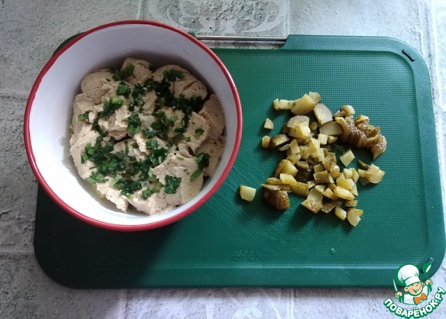 Печень присыплю немного зелёным луком. Так как она уже жирная, слой с печенью я не буду промазывать майонезом. Маринованные огурцы мелко режем.