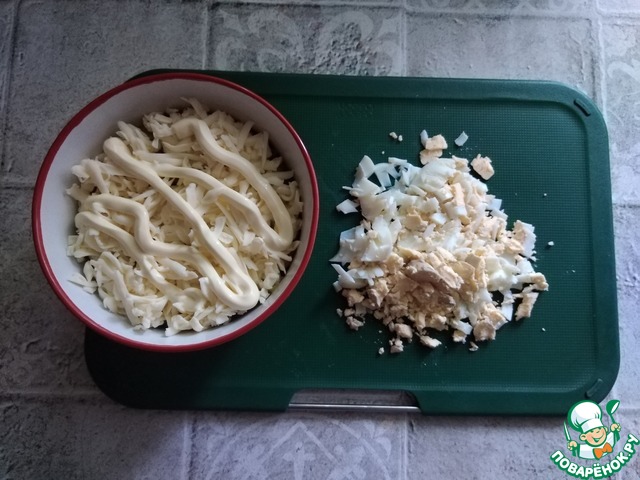 Выкладываем следующим слоем и поверх - сетку майонеза. Сыр вынимаем из морозилки и натираем на тёрке средней величины.