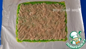 Противень застелите пергаментом и выложите омлетную массу. Выпекать в разогретой духовке 10-12минут при 180°.