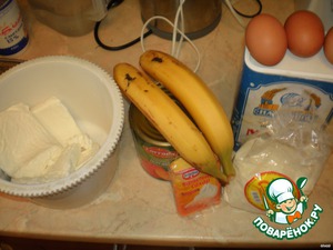 Смешать творог с сахаром, ванилином, бананами