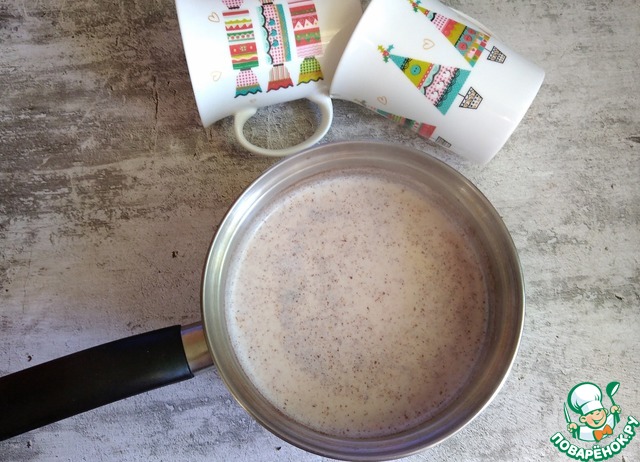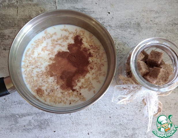 Варим напиток. Овсяные хлопья нужно размолоть в кофемолке. Можно использовать овсяную муку. Молоко наливаем в кастрюльку, выкладываем овсяные хлопья, корицу, ванилин, коричневый сахар (белый). Ставим на огонь, перемешиваем, доводим до кипения и варим пару минут. Если вы будите использовать мёд, то выкладывайте его в уже разлитый напиток по стаканам.