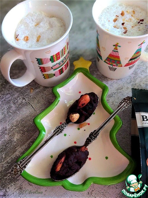 Шоколад быстро густеет. Нужно быстро отправить в него орехи с цукатами, перемешать и зачерпнуть приготовленными ложками, для подачи к напитку, с верхом. Поставить в холодильник застывать.