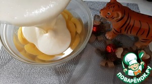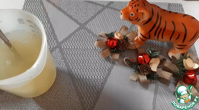 Готовим первый слой. Сироп от персиков смешиваем с водой, хорошо перемешиваем.