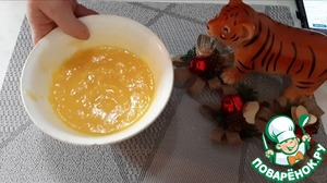 Набухший желатин и персиковое пюре подогреваем в микроволновке, но не доводим до кипения. Выливаем желатин в персиковое пюре и хорошо перемешиваем.