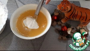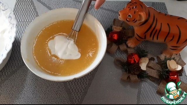 Выкладываем 3 ст. л. сметаны в персиковую массу, чтобы выравнить температуру. Хорошо перемешиваем.