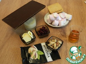 Печенье измельчим, маршмеллоу порежем на кусочки, орехи отделим от скорлупы, вяленая клюква уже готовая к употреблению.