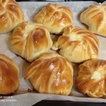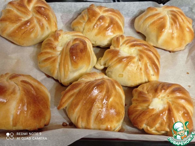 В центр каждой тонкой лепёшки выкладываем начинку и собираем концы теста вверху к одной точке, формируя "мешочек". Поворачиваем его вдоль своей оси и расправляем свободные концы формируя складки у пирогов. оставшиеся концы подворачиваем на дно пирога.