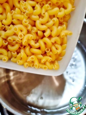 Затем добавьте отварные рожки. Хорошо перемешайте. Всё это уже может стать отличным ужином. Очень вкусно!