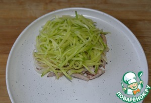 • Куриное филе предварительно отвариваем в подсоленной воде, у меня отваренные голени. Режем тонкими полосками. Кладём на блюдо для подачи.
