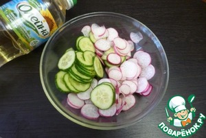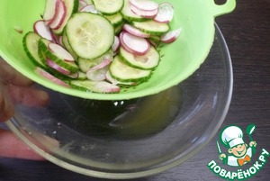 Тонко нарезать свежий огурец и редис. Огурец у меня длинноплодный, редис крупный. Посолить нарезку и откинуть на дуршлаг минут на 20-30, чтобы стекал сок.