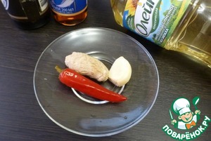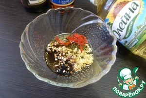 Чеснок, имбирь и чили измельчить, добавить немного сахара, влить соусы и масло. Перемешать.