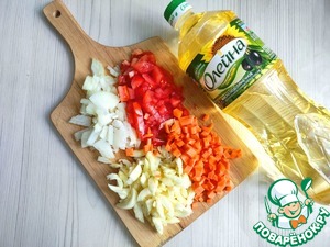 Овощи: лук (1 шт.), морковь (1 шт.), помидор (1 шт.), кабачок (1 шт.) нарезать мелкими кубиками.