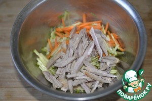 • Вареное куриное филе режем тонкими полосками (у меня мясо с голеней). Добавляем в салат.